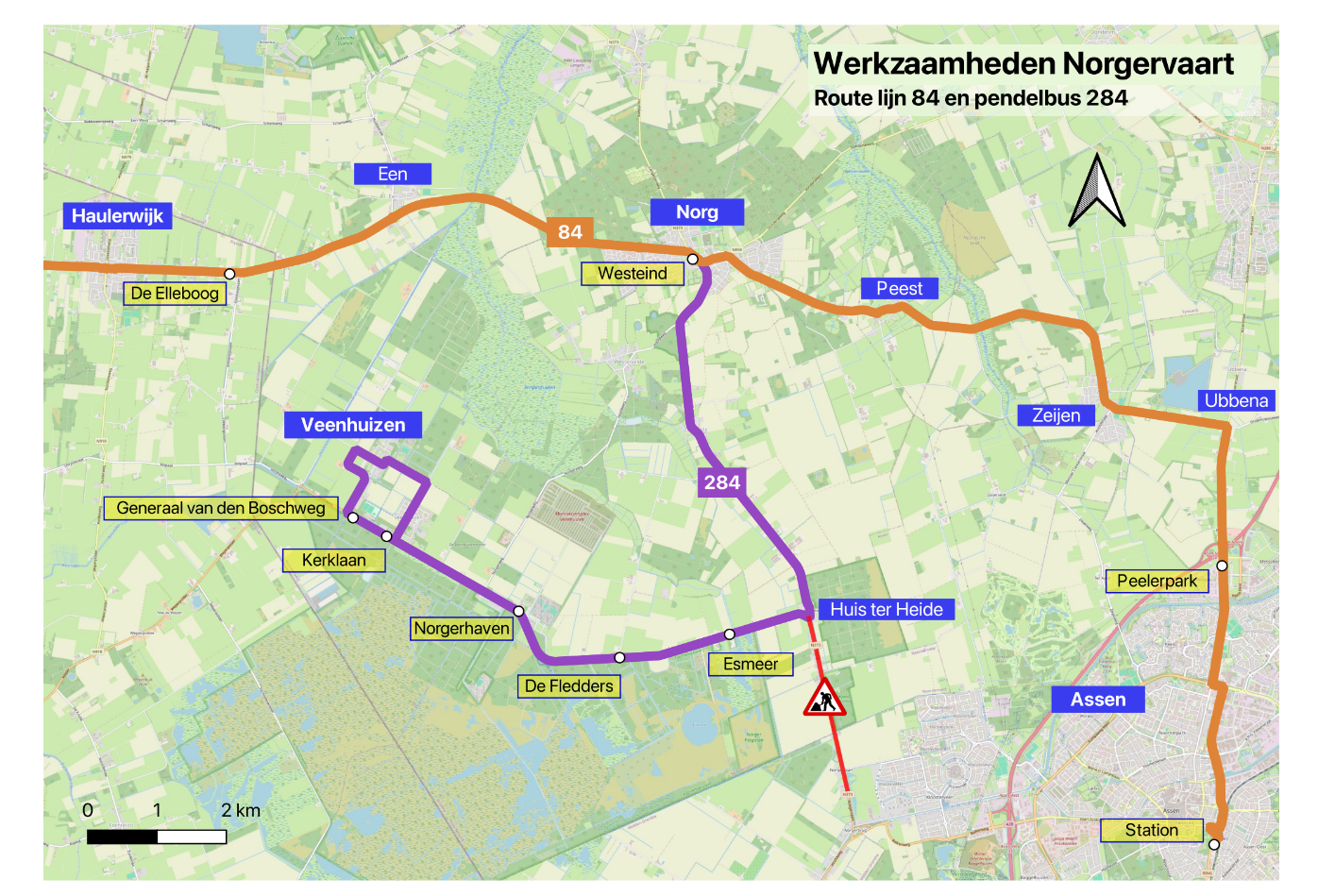 Vanaf 5 januari rijdt lijn 84 door werkzaamheden om via Norg, met een pendelbus voor Veenhuizen en op enkele momenten de HUBtaxi.
