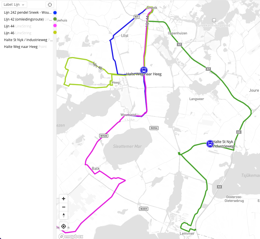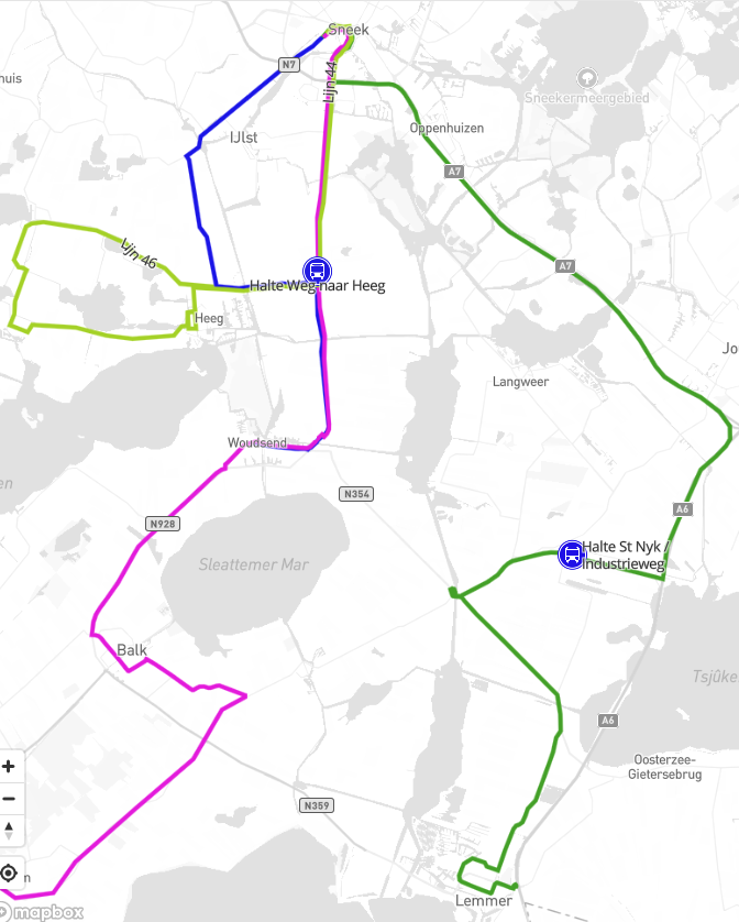 - Reizigers op het traject Heeg – Woudsend kunnen overdag gebruikmaken van lijn 46 naar halte Weg naar Heeg en daar overstappen op lijn 44 richting Woudsend, en andersom.
